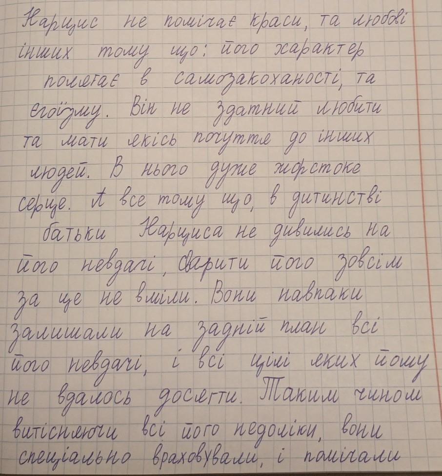 Нарцис не помічає краси, та любові інших тому що: його характер полягає в самозакоханості, та егоїзму. Він не здатний любити та мати якісь почуття до інших людей. А нього дуже жорстке серце.