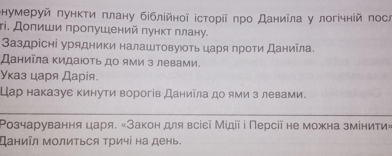 3. Пронумеруй пункти плану біблійної історії про Даниїла у логічній послідов- ності. Допиши пропущений пункт плану.