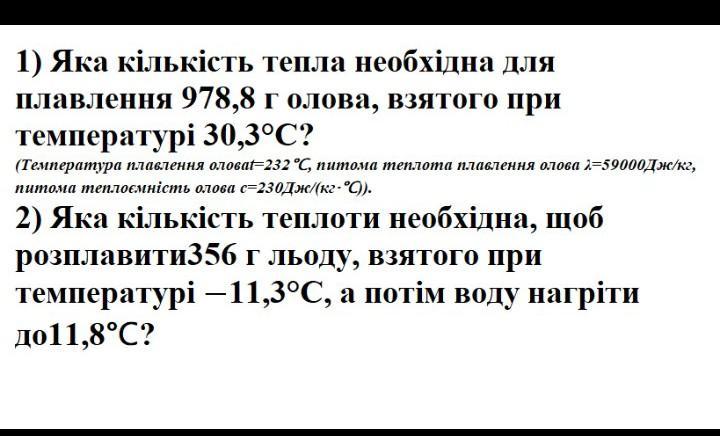 1) Яка кількість тепла необхідна для плавлення 978,8 г олова, взятого при температурі 30,3°C? (Температура плавлення олова-232 °C, питома теплота плавлення олова 2=59000Дж/к. питома теплоємність олова с=230Дж/(кг-°C)).