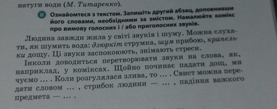 Людина завжди жила у світі звуків і шуму. Можна слуха- ти, як шумить вода: дзюркiм струмка, шум прибою, крапель ки дощу. Ці звуки заспокоюють, знімають стреси. Інколи доводиться перетворювати звуки на слова, як, наприклад, у коміксах. Щойно починає падати дощ, ми чуемо Коли розгулялася злива, то ... . Свист можна пере- дати словом стрибок людини ... , падіння важкого предмета .... ... 9 ****