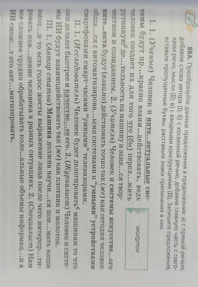 88A. Преобразуйте данные предложения в предложения: а) с прямой речью, добавив слова автора (I); б) с косвенной речью, добавив главную часть с глаго- лами речи, мысли (II); в) с вводными конструкциями (III). Запишите предложения, вставьте пропущенные буквы, расставьте знаки препинания в них.