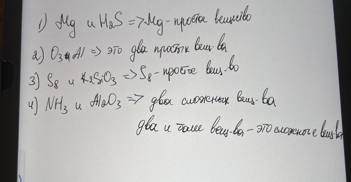 4. К простым веществам относится каждое из двух веществ, формулы которых: 1) Mg и H2S; 2)O3 и Al; 3)S8 и К2SiO3; 4)NH3 и Al2O3