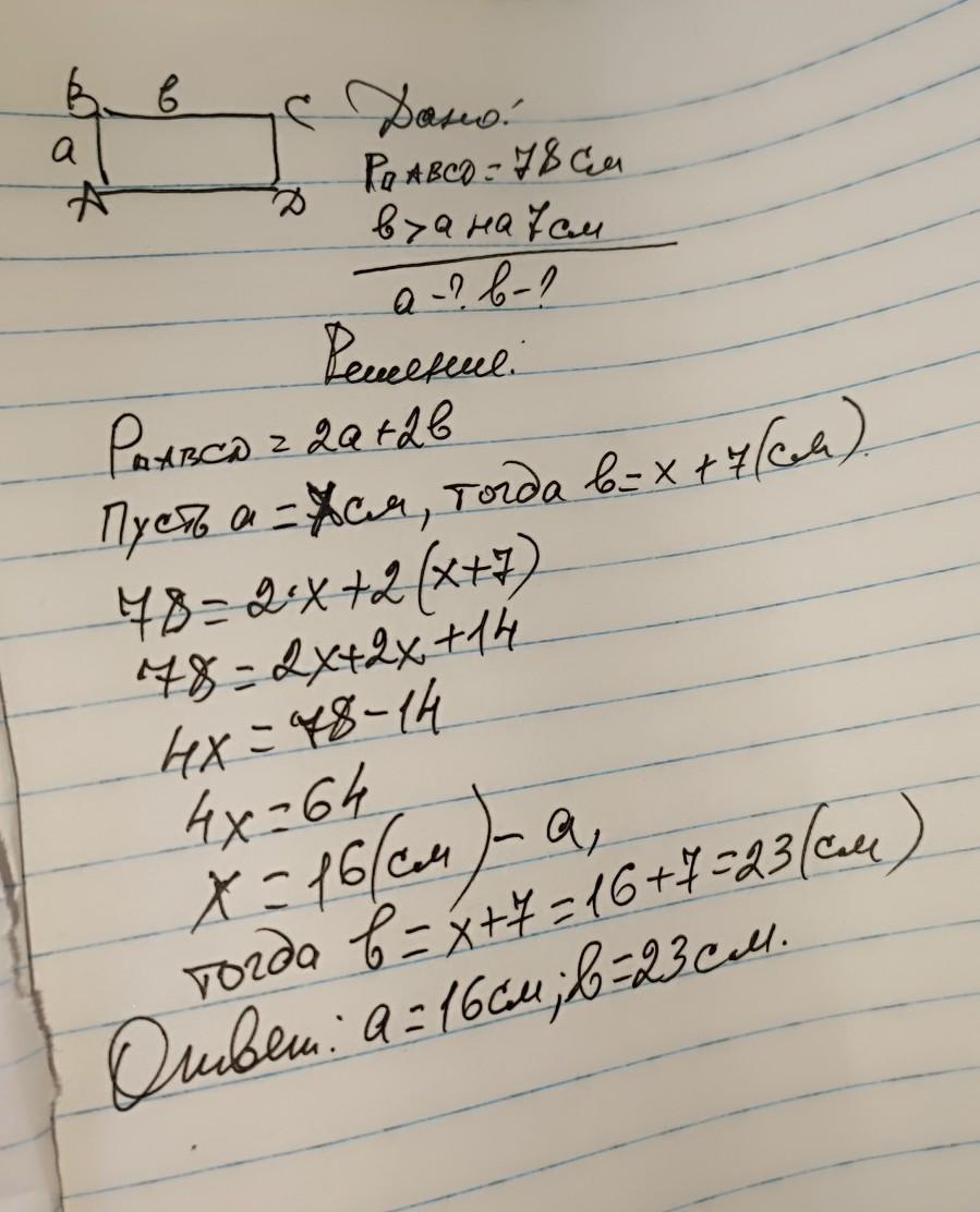 Периметр прямокутного аркуша дорівнює 78 см, а одна його сторона довша за другу на 7 см. Знайдіть довжини сторін аркуша.