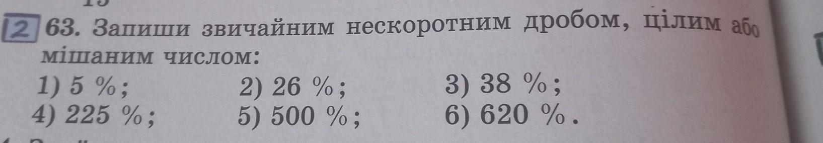 15 2] 63. Запиши звичайним нескоротним дробом, цілим або мішаним числом: 1) 5 %; 4) 225 %; Знайди 2) 26%; 5) 500 %; 3) 38 %; 6) 620 %.