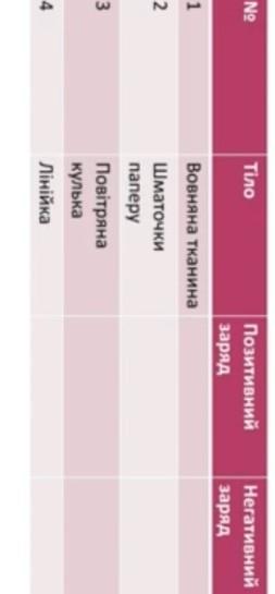 4. Записати, які заряди (позитивні або негативні) накопичились на поверхні вовняної тканини, шматочків паперу, зарядженої повітряної кульки і лінійки. Оформити відповідь у вигляді таблиці.