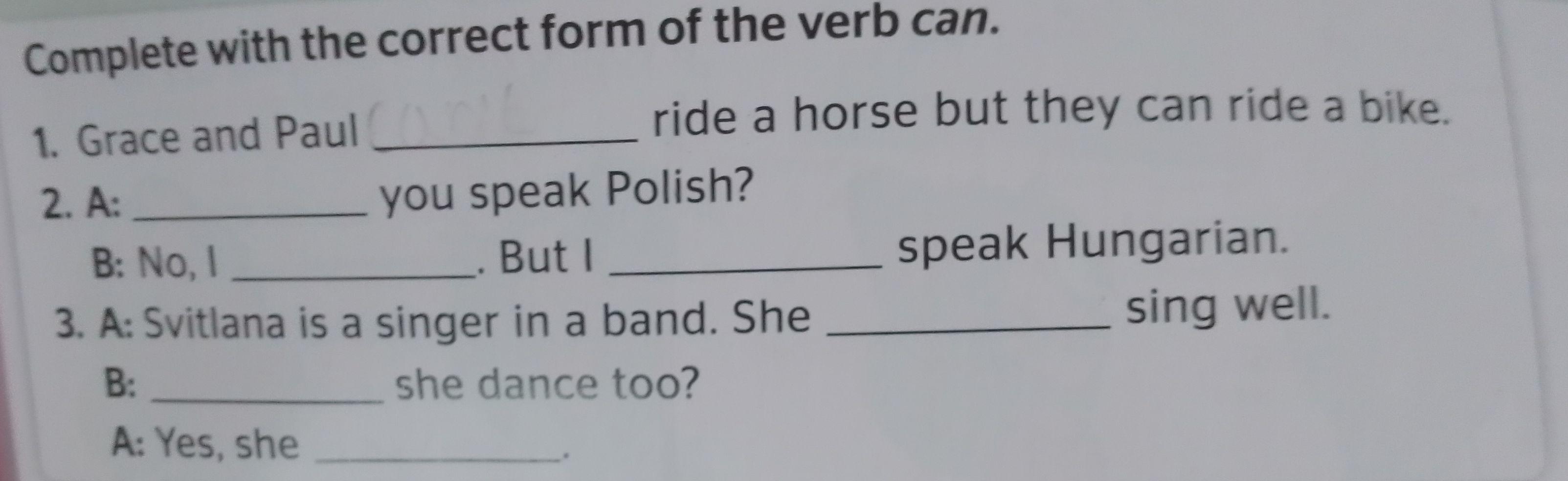 У 2A буде can тому що це запитання, у B в першому пропуску буде can’t через заперечення. у другому В буде can,тому що він не може робити минулу згадану дію, але може робити іншу.