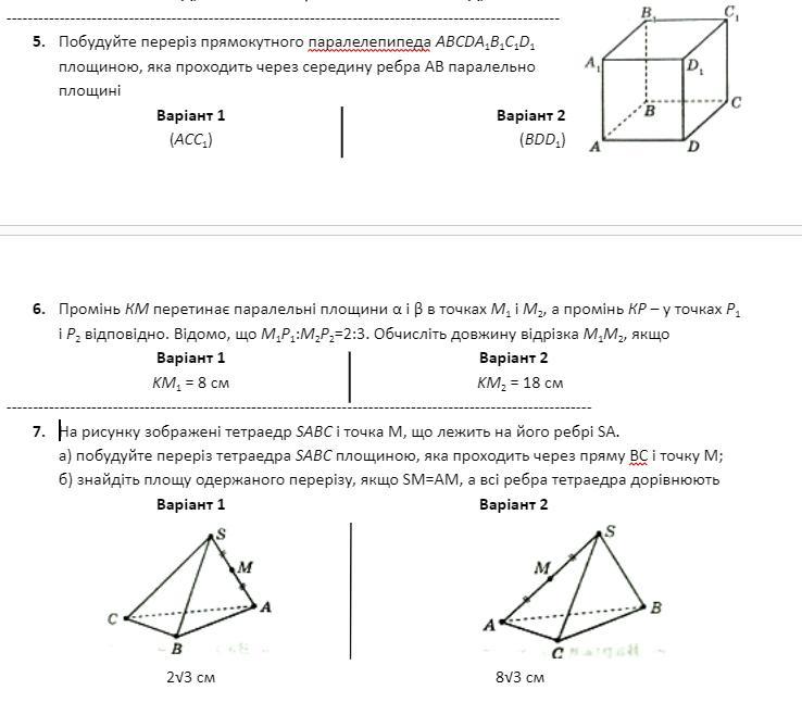 2)Промінь КМ перетинає паралельні площини α і β в точках М1 і М2, а промінь КР – у точках Р1 і Р2 відповідно. Відомо, що М1Р1:М2Р2=2:3. Обчисліть довжину відрізка М1М2, якщо