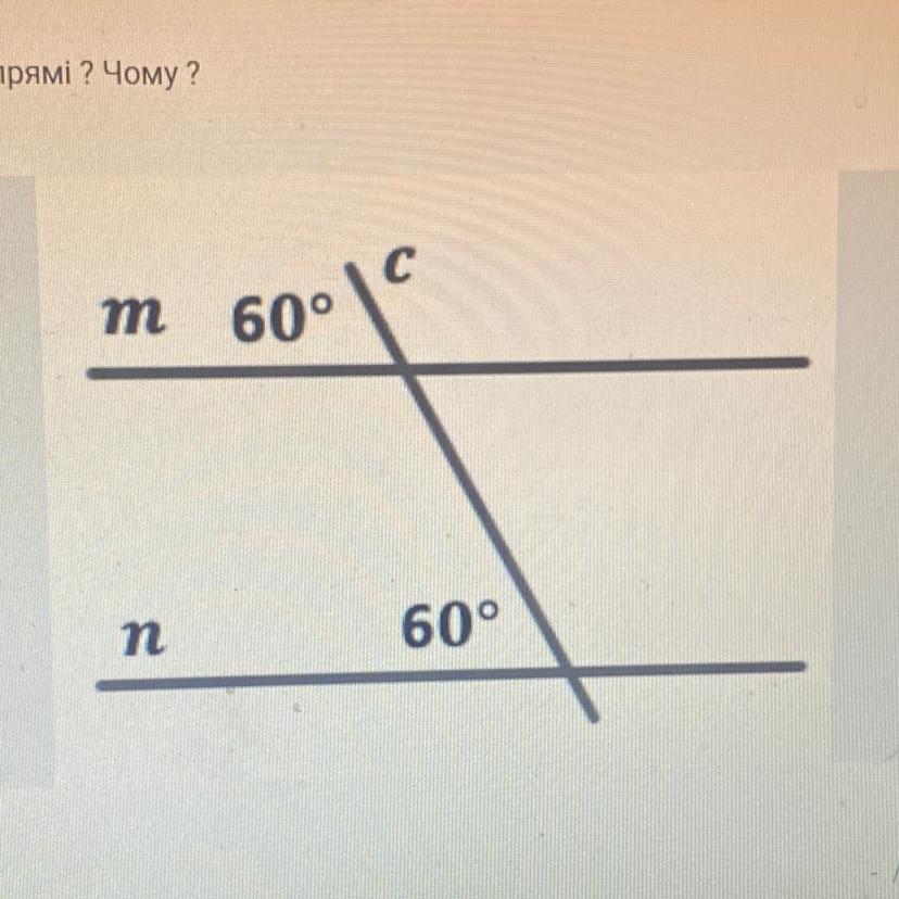 Ні, прямі m і n не паралельні. Це можна визначити за ознакою паралельності прямих, яка говорить, що внутрішні протилежні кути при перетині двох прямих доповнюють один одного до 180°. У даному випадку внутрішні протилежні кути m і n дорівнюють 60° кожен, тобто вони не доповнюють один одного до 180°. Отже, прямі m і n не паралельні.
