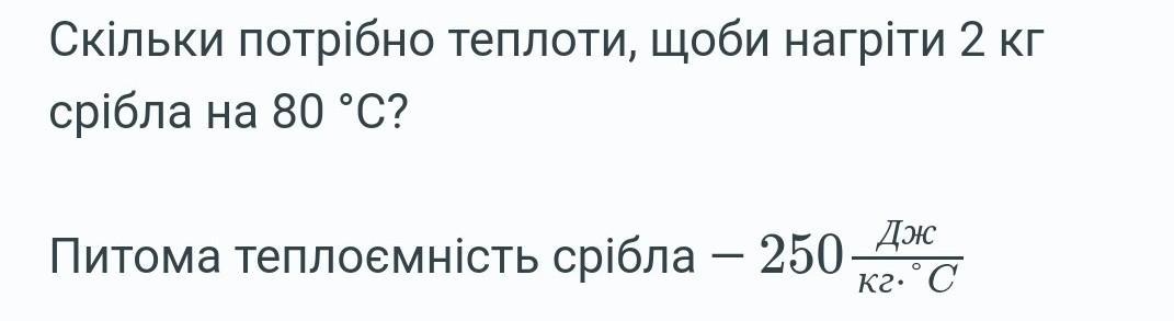 відповідь: для нагрівання 2 кг срібла на 80°C необхідно 40,000 Дж теплоти.