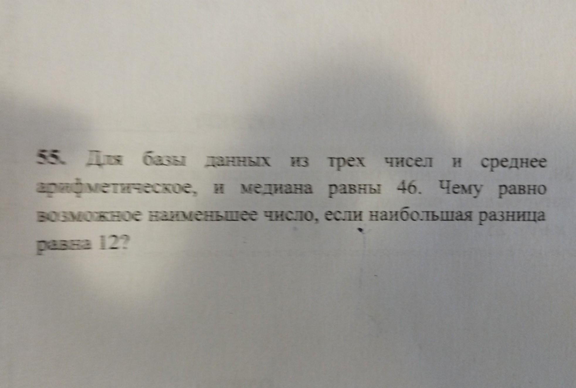 55. Для базы данных из трех чисел и среднее арифметическое, и медиана равны 46. Чему равно возможное наименьшее число, если наибольшая разница равна 12?