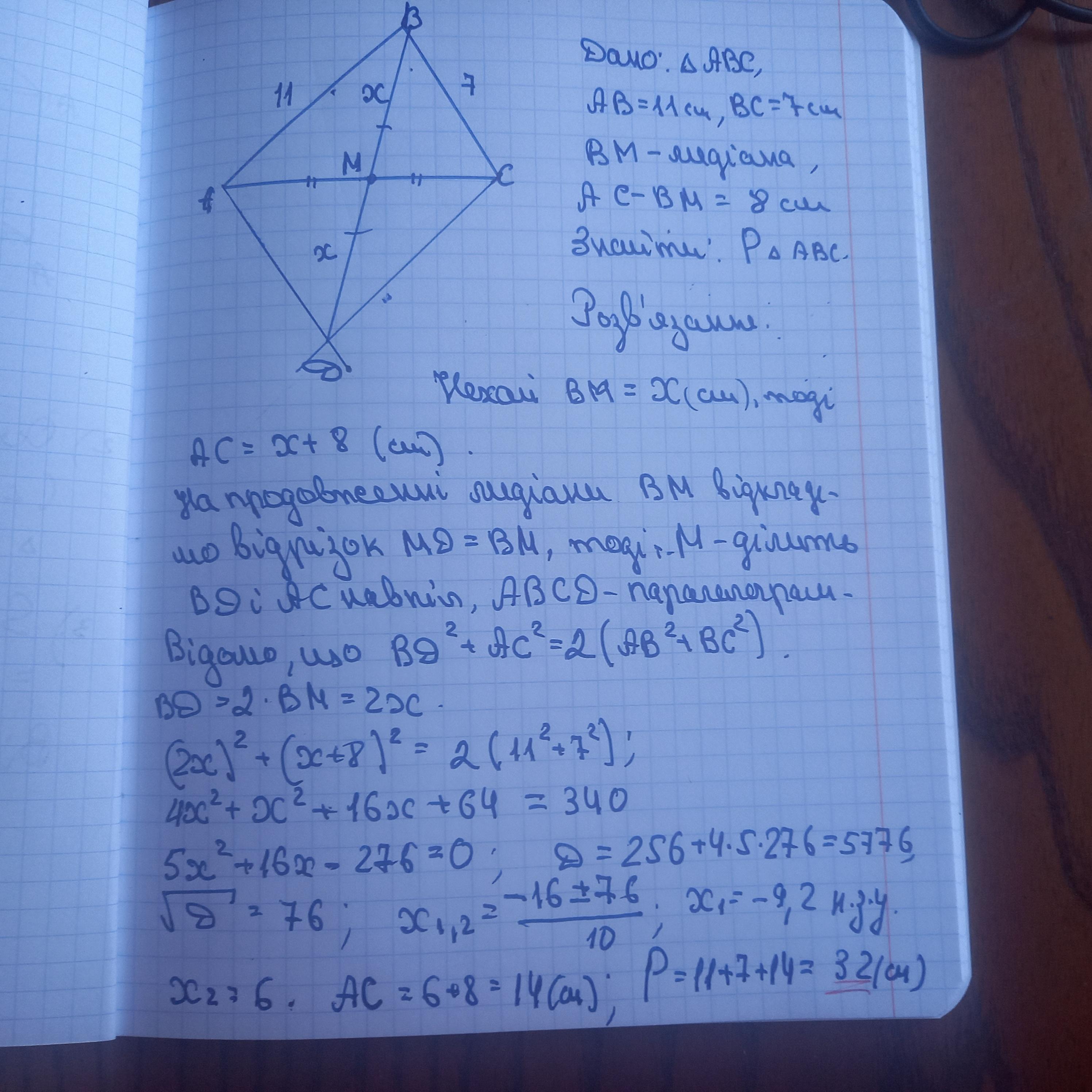 Дві сторони трикутника дорівнюють 7 см і 11 см, а медіана, проведена до