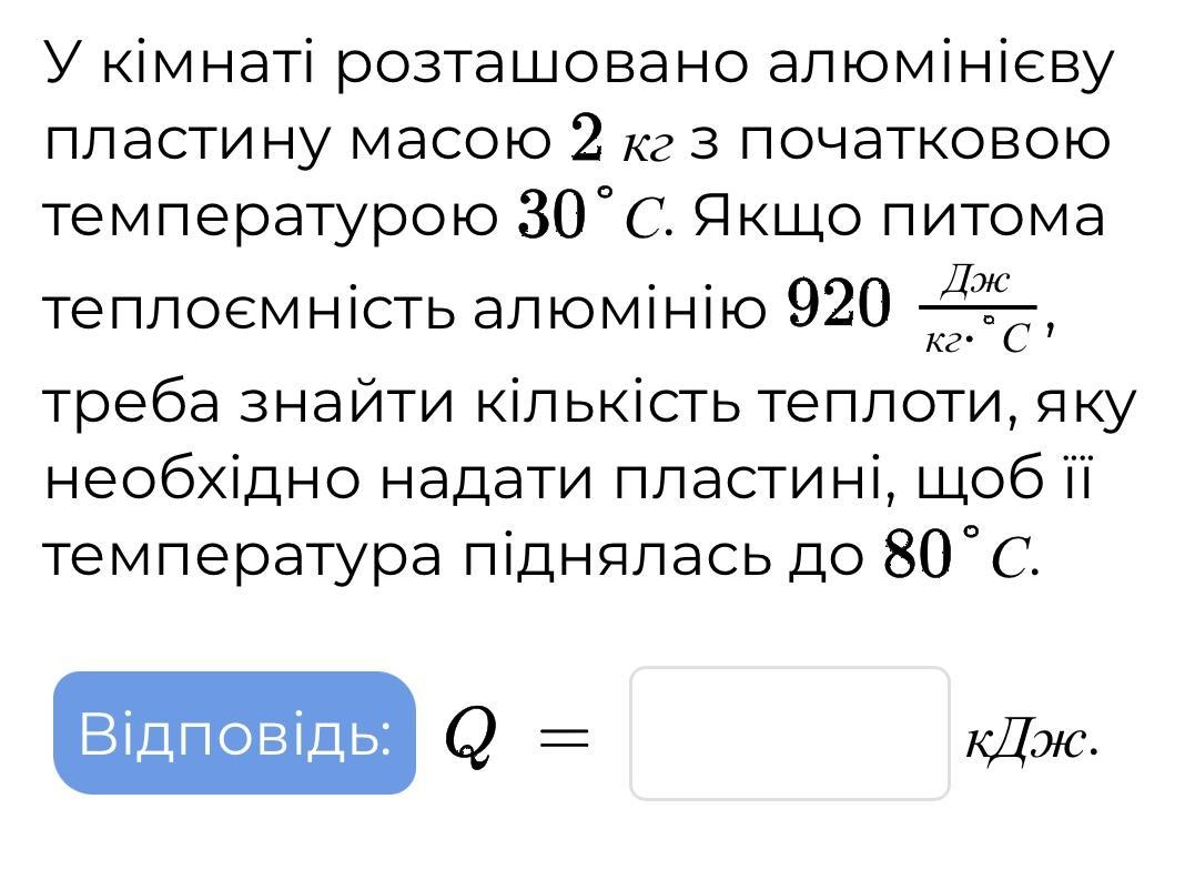Q= 920 Дж/кг×°С × 2 кг × 30°С= 55.200 Дж