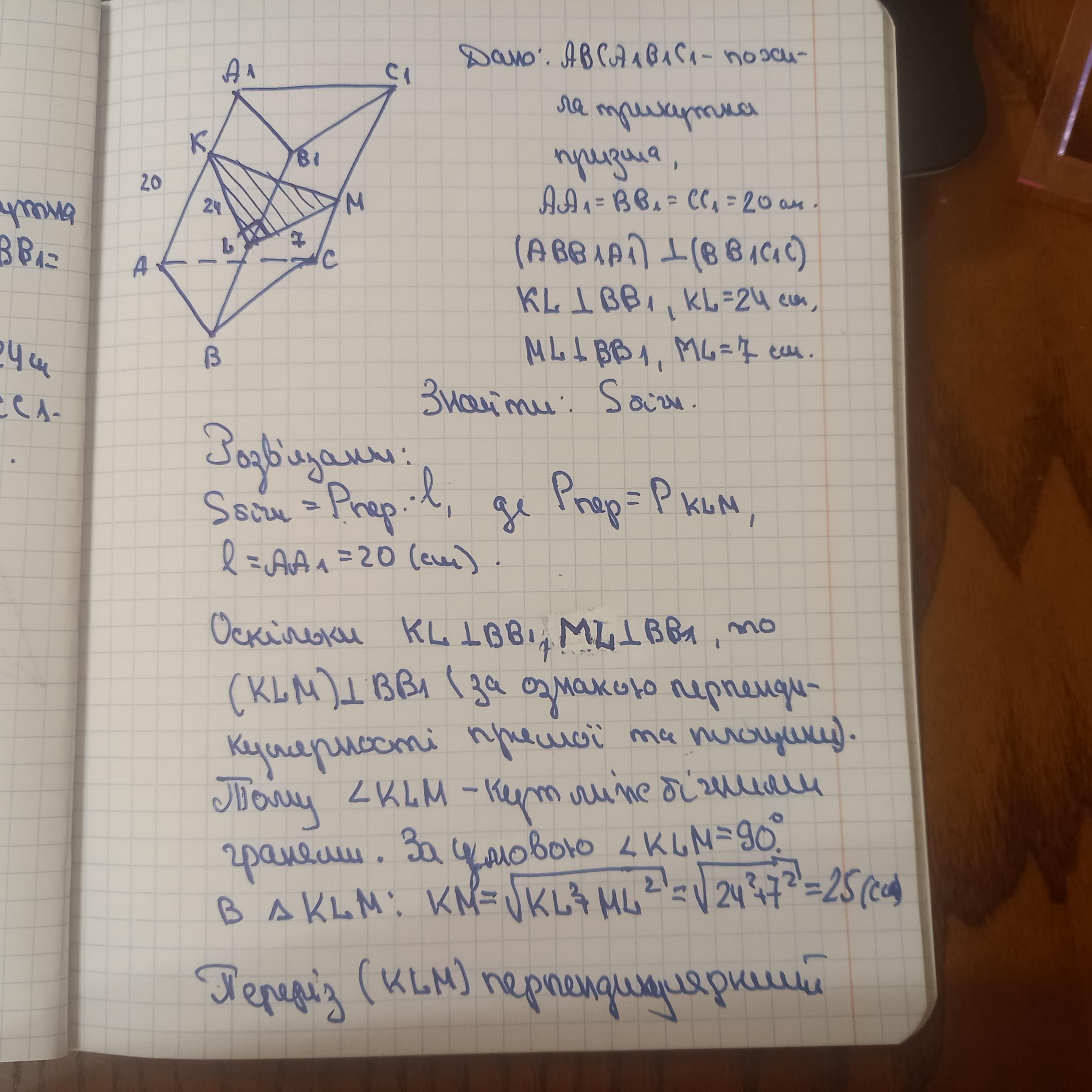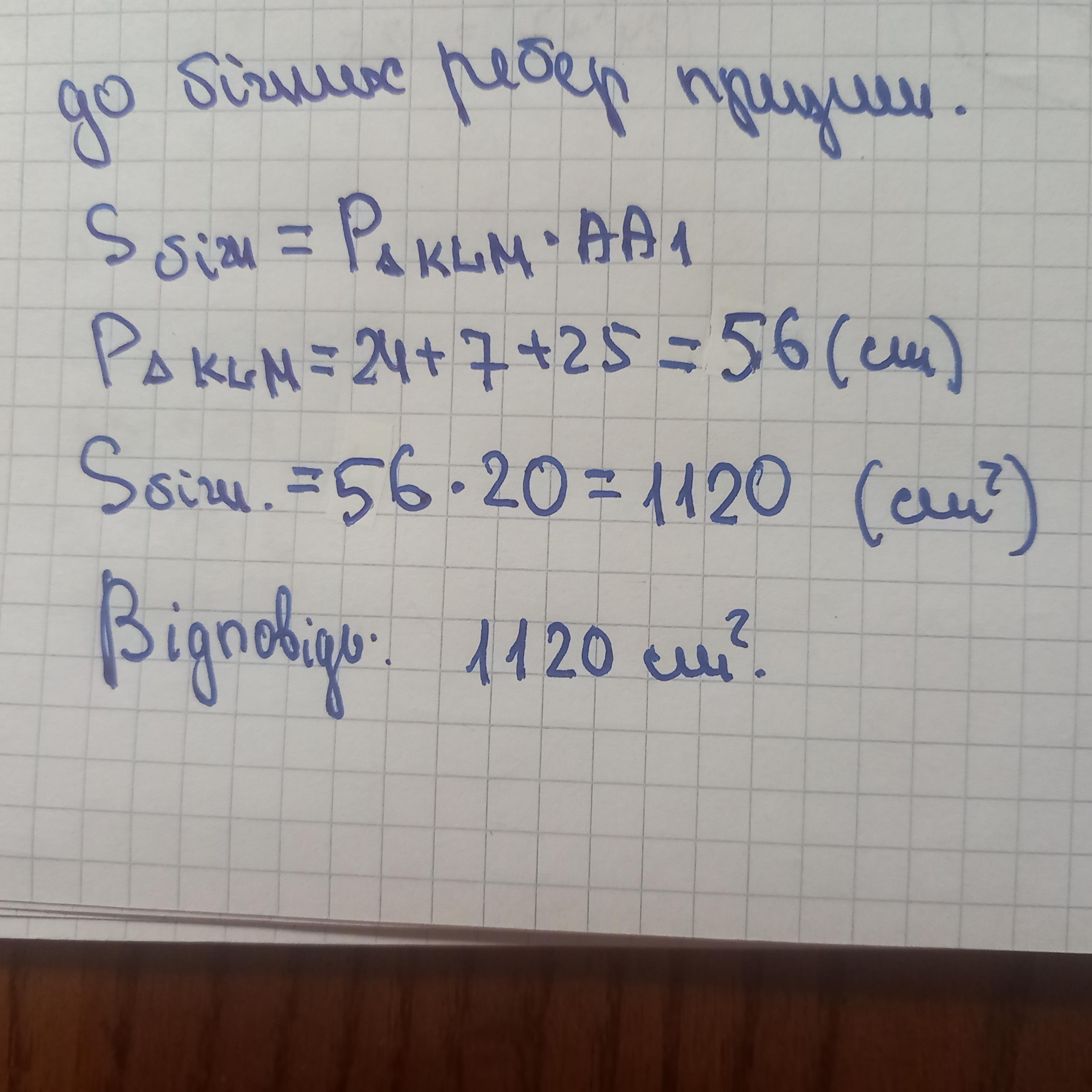 Бічне ребро похилої трикутної призми дорівнює 20 см. Дві бічні грані призми взаємно перпендикулярні, а їхнє спільне ребро віддалене на 7 см і 24 см від двох інших бічних ребер. Знайдіть площу бічної поверхні призми.