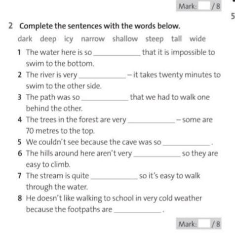 дополните предложения с данными словами:1.deep- глубокий, wide-обширный, narrow-узкий, tall-высокий, dark- темный, shallow-мелкий, icy-ледяной.
