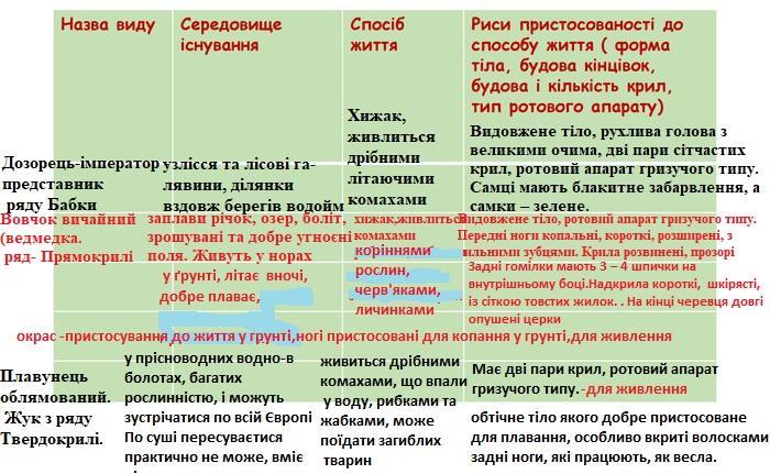 Таблиця 6. РИСИ ПРИСТОСОВАНОСТІ КОМАХ ДО СПОСОБУ ЖИТТЯ