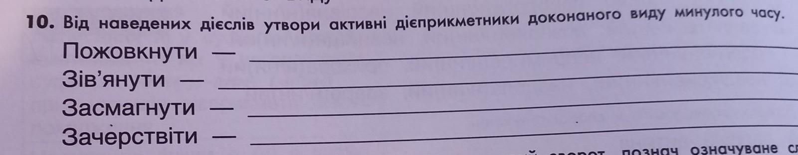 10. Від наведених дієслів утвори активні дієприкметники доконаного виду минулого часу. Пожовкнути Зів'янути Засмагнути Зачерствіти - - - augu озномуалне CROR