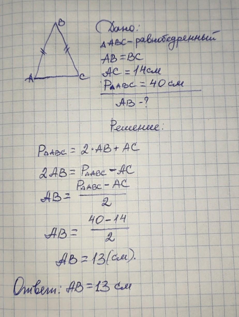 400. Периметр рівнобедреного трикутника 40 см, а його основа - 14 см. Знайти бічну сторону трикутника. помогите мне