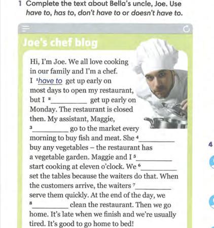 перевод:дополните текст о дяде Беллы, джо. используете модальные глаголы have to has, don't have to или doesn't have to. have to- переводится как должен/обязан.между have to и has to есть разница:has to стоит после местоимений he, she, it(он, она, оно) в позитивных предложениях, а have to после I, you, we, they (я, ты, мы, они) и в множественном числе. don't have to/doesn't have to-это их форма в негативных предложениях (present simple), они переводится как не обязан/не должен. между ними тоже есть разница:вообще они глаголы, а в present simple- настоящем простом времени добавляются окончания -es либо -s после местоимений he she it, но когда мы хотим добавить "не" тоесть создать негативные предложения, мы добавляем don't (do not) после I you we they, а после he she it у нас doesn't так как окончания -es и -s добавляется к нему, а форма глагола которое идет после него не меняет форму