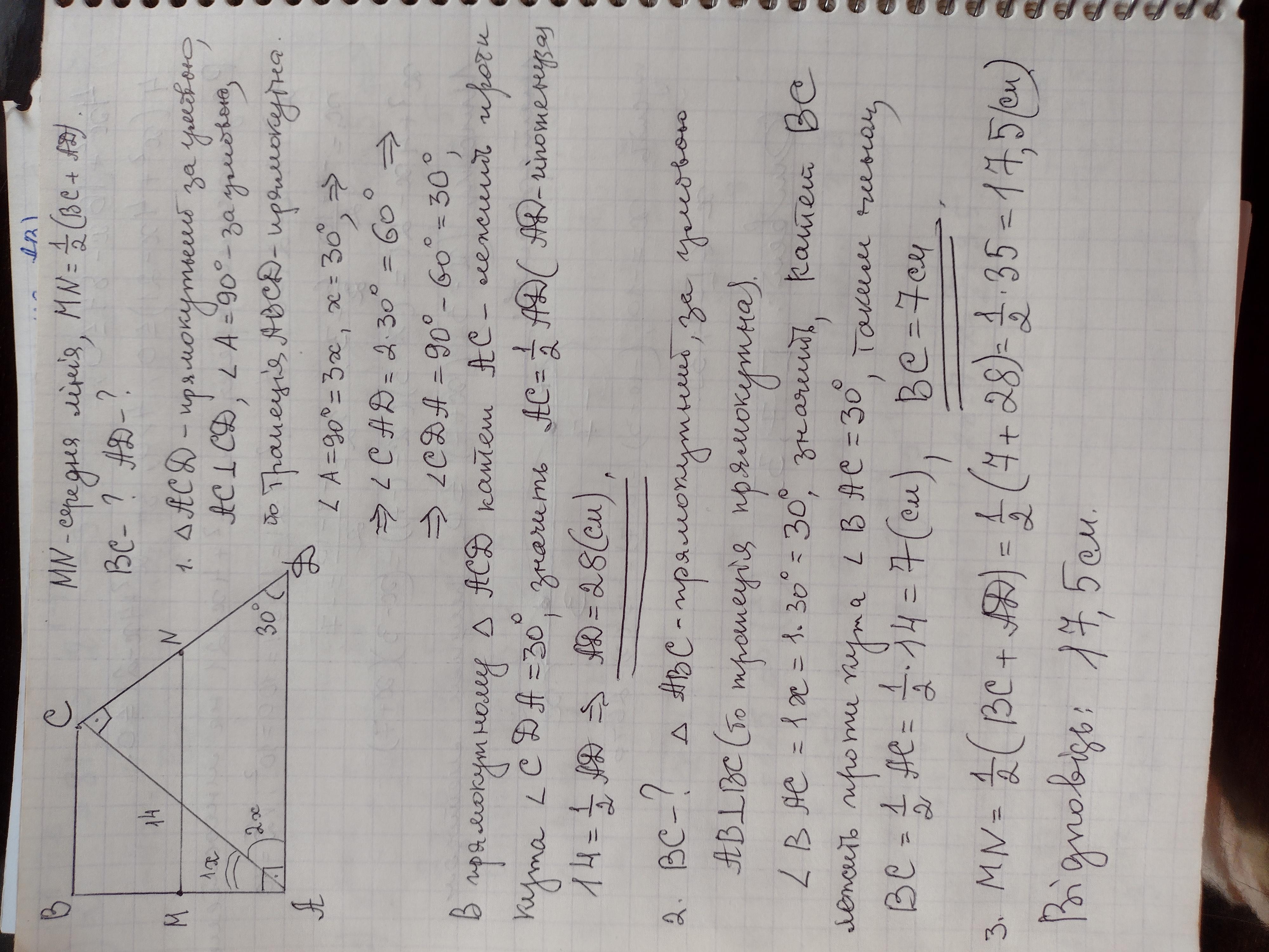 14 см, перпендикулярна до бічної сторони С'D і поділяє кут А у відношенні 2 : 1, рахуючи від більшої основи. Знайдіть середню лінію трапеції
