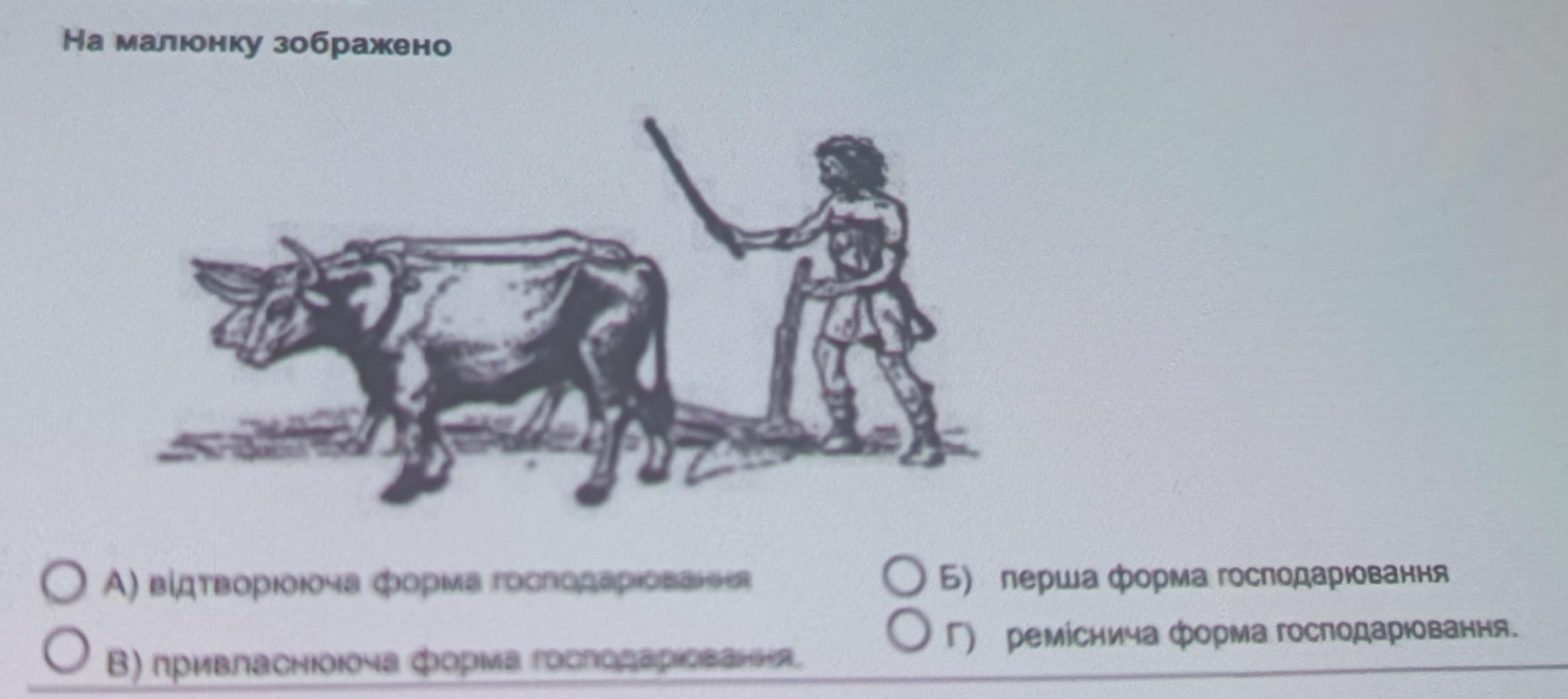 На малюнку зображено А) відтворююча форма господарювання в) привласнююча форма господарювання. Б) перша форма господарювання г) реміснича форма господарювання.