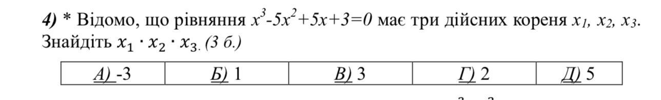Відомо, що рівняння x³-5x²+5x+3=0 має три дійсних кореня x₁, x₂, x₃. Знайдіть x₁·x₂·x₃. (З рішенням)
