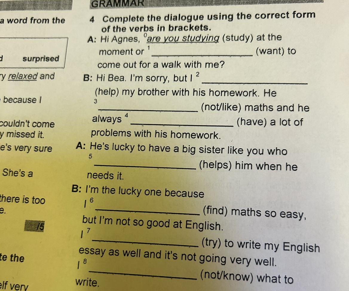 B: Hi Bea. I'm sorry, but I'm helping (help) my brother with his homework. He doesn't like (not/like) maths and he always has (have) a lot of problems with his homework. He's lucky to have a big sister like you who helps (help) him when he needs it.