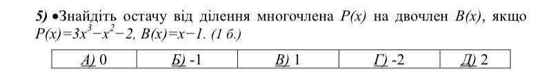Знайдіть остачу від ділення многочлена Р(х) на двочлен В(х), якщо Р(х)= 3x³-x²-2, B(x)= x-1. (З рішенням)
