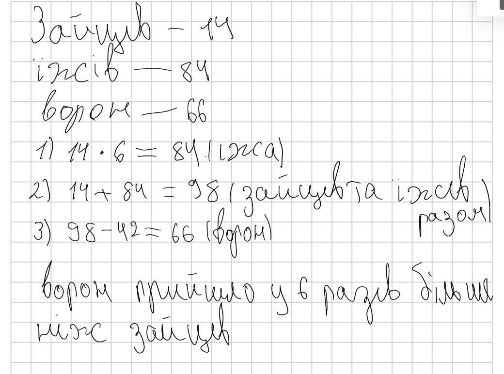 На огляд до лісового лікаря прийшли 14 зайців, їжа у 6 разів більше, а ворон - на 42 менше, ніж зайців і разом. На скільки більше прийшло ворон, нiж зайців