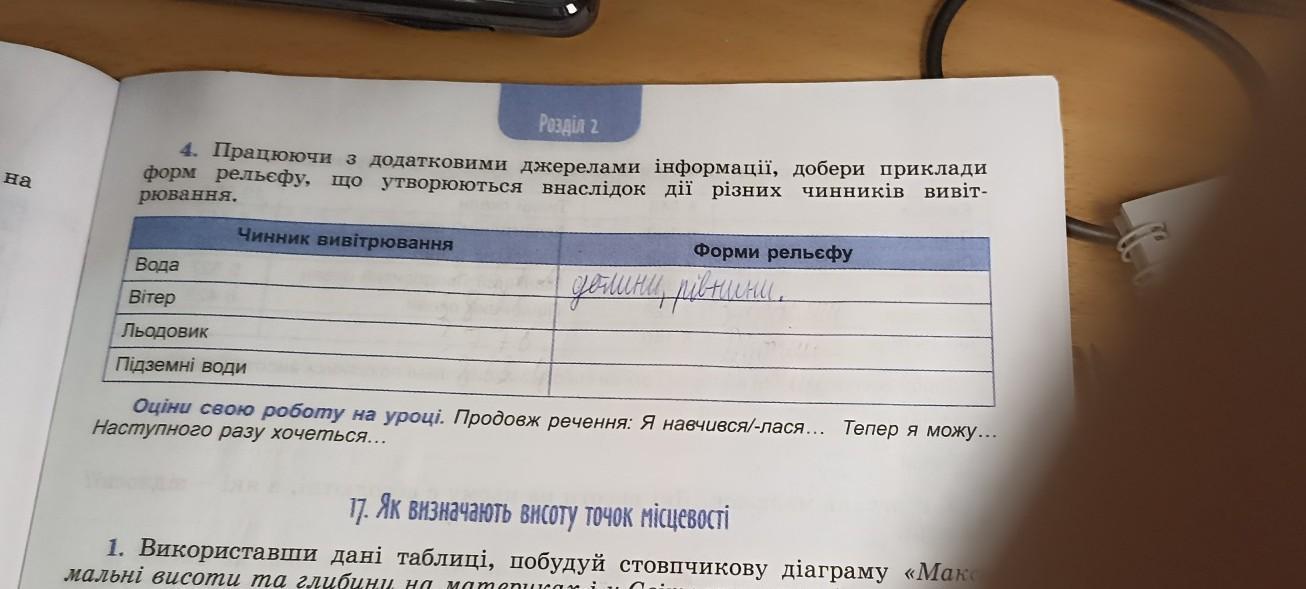 4. Працюючи з додатковими джерелами інформації, добери приклади форм рельефу, що утворюються внаслідок дії різних чинників вивіт рювання.