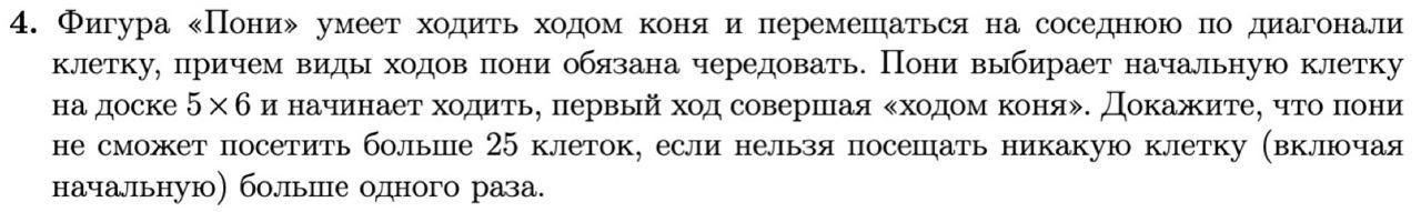 Розглянемо можливі рухи поні. Після початкового ходу "ходом коня" (що дає нам 2 можливі клітини для відвідування), ми можемо переміщатися на сусідню по діагоналі клітину. Однак зараз ми вже використали 2 клітини, і кількість доступних для відвідування клітин обмежена 4. Для кожного наступного руху на діагональ ми додаємо ще 2 клітини до нашого "запасу". Таким чином, кожен діагональний рух додає 2 нові клітини для відвідування.