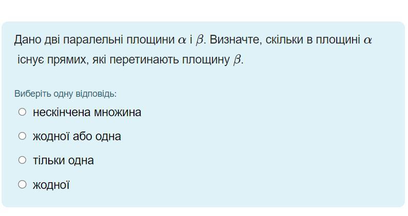 Дано дві паралельні площини і . Визначте, скільки в площині існує прямих, які перетинають площину .