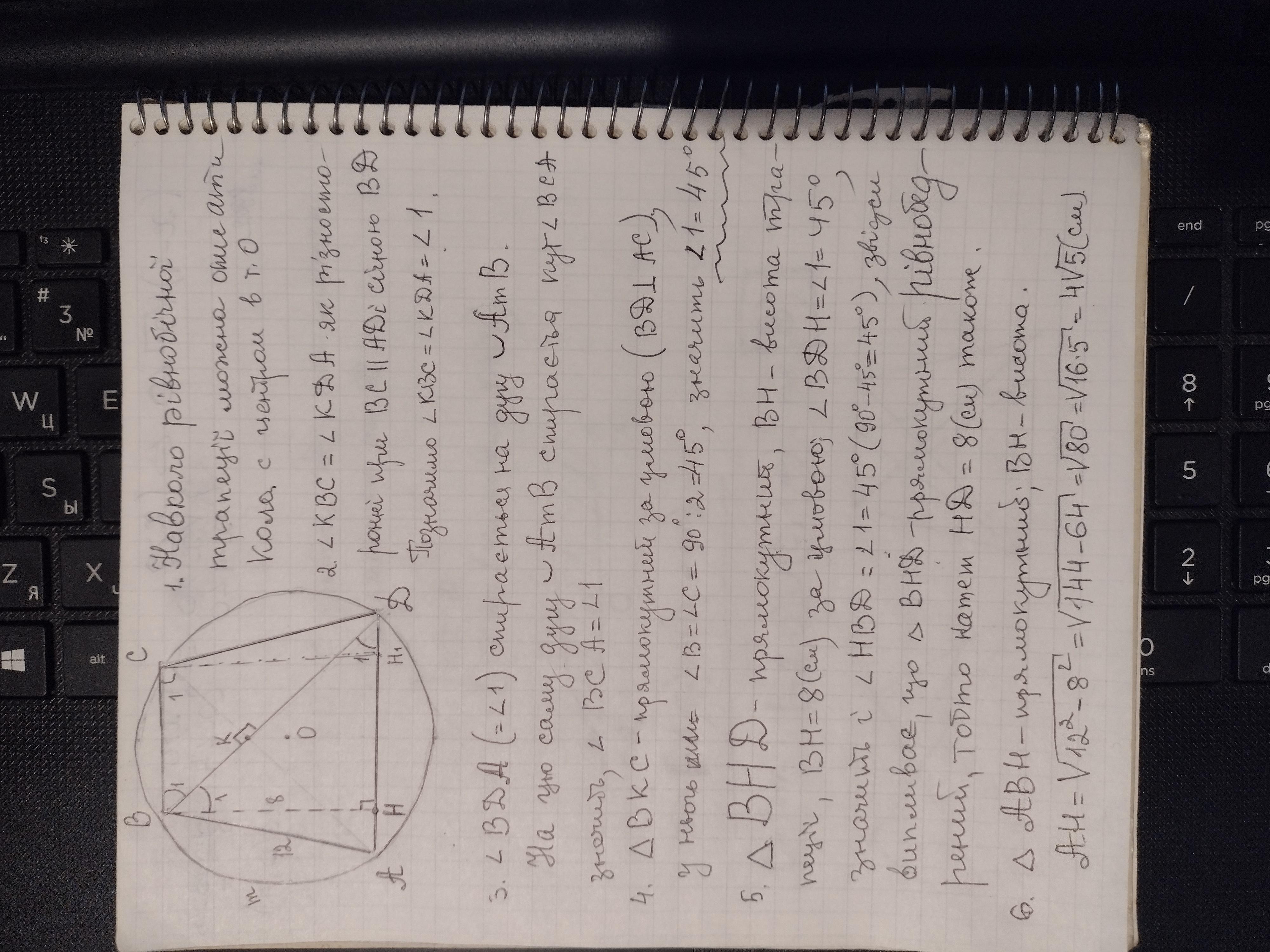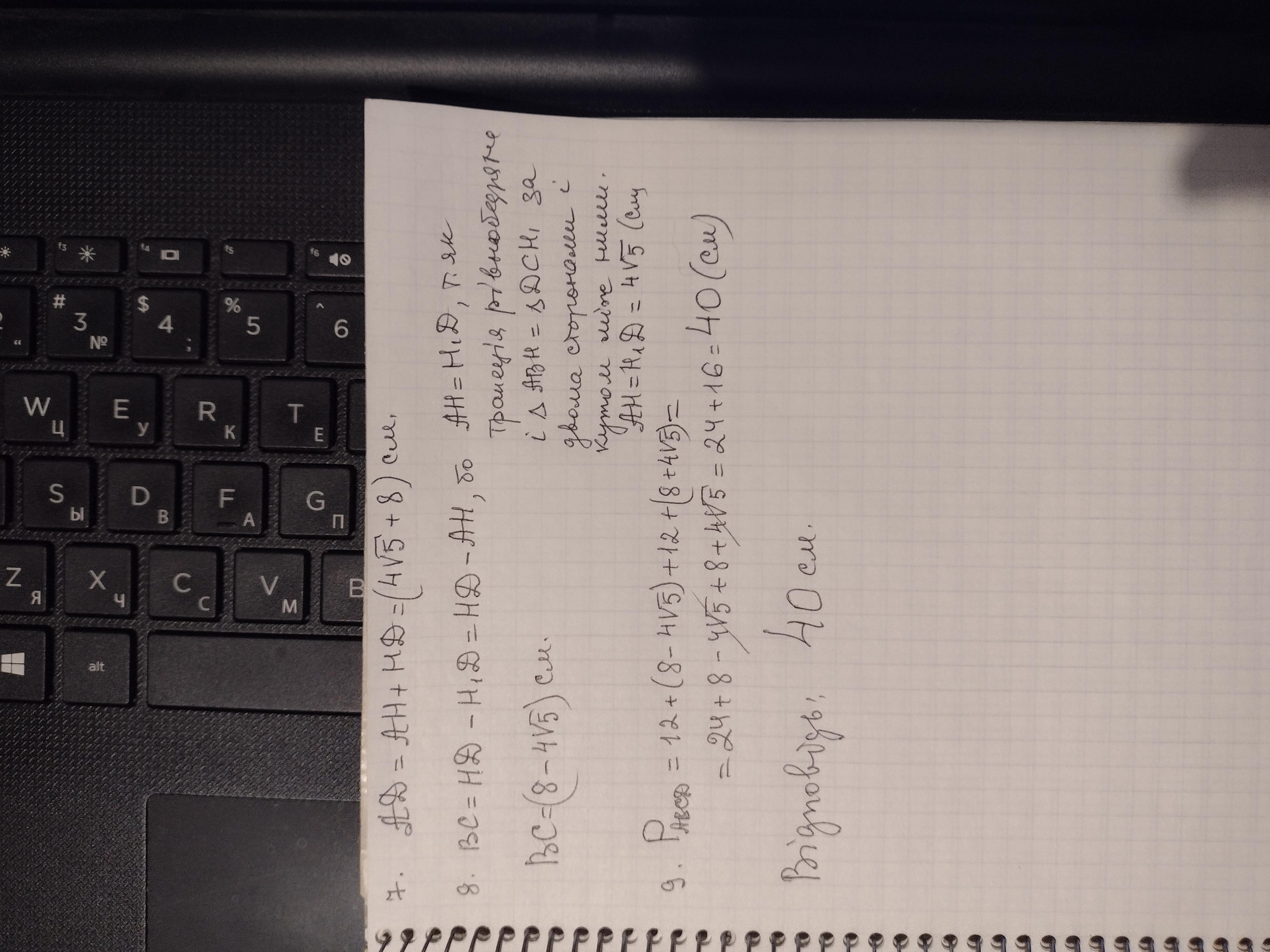 У рівнобічній трапеції діагоналі перпендикулярні. Висота трапеції дорівнює 8 см. Знайдіть периметр трапеції, якщо її бічна сторона дорівнює 12 см. (Всі властивості рівнобічної трапеції із перпендикулярними діагоналями, які Ви будете використовувати, треба довести)