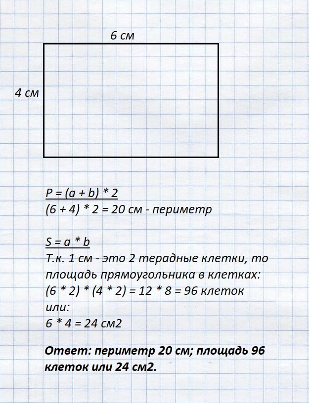 начертите в тетради прямоугольник со сторонами 6 см и 4 см вычисли его периметр. сколько клеток составляет площадь этого прямоугольника? сколько это квадратных см?