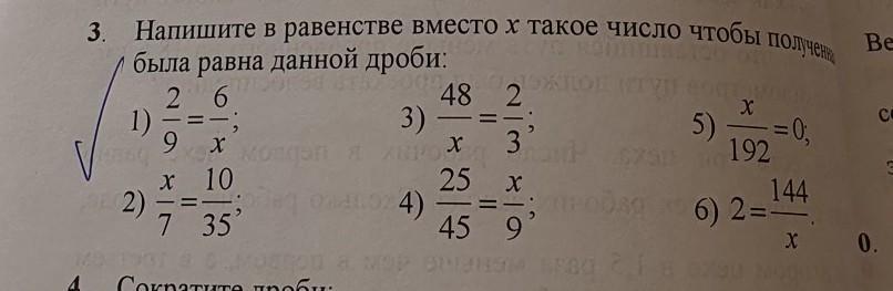 3. Напишите в равенстве вместо х такое число чтобы была равна данной дроби: 1) 2) 26 -- 9 x —— X 10 7 35' 3) 4) 48 2 X 25 45 = nim sia = 5) получе