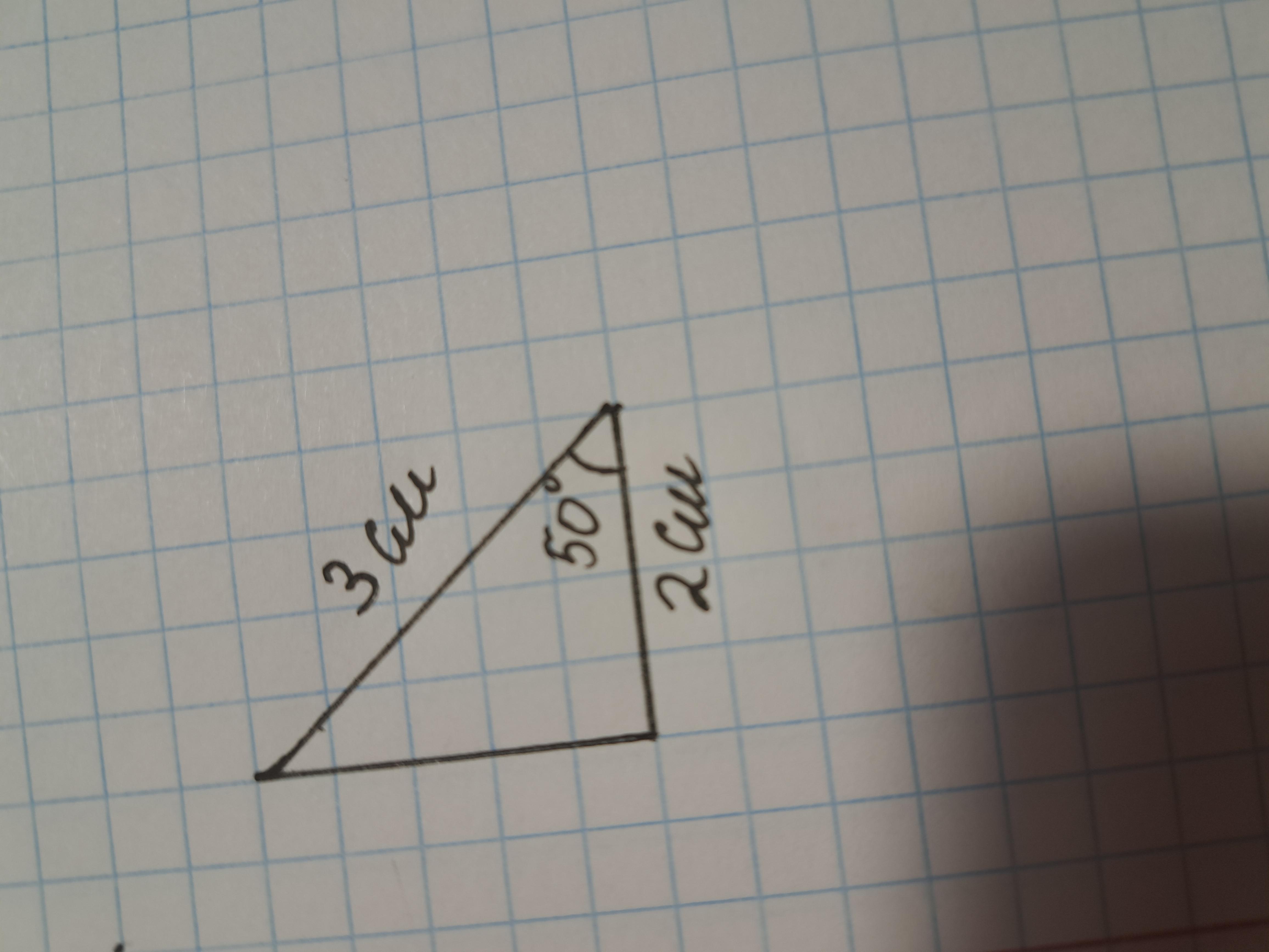 за допомогою лінійки та транспортира побудуйте трикутник дві сторони якого дорівнюють 3 см та 2 см а кут між ними 50 градусів