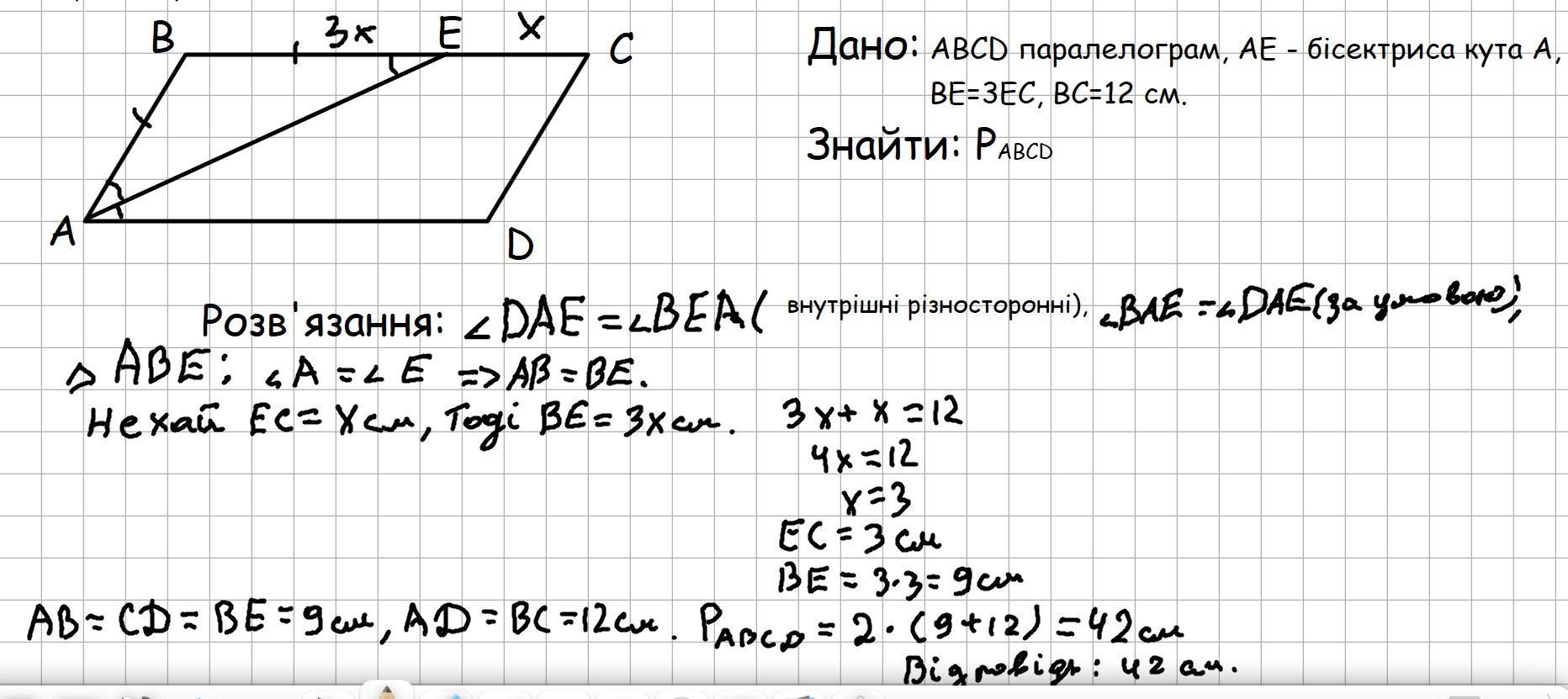 У паралелограмі ABCD бісектриса кута А перетинає пряму ВС у точці Е. Відрізок ВЕ більший за відрізок ЕС у 3 рази. Знайдіть периметр паралелограма, якщо ВС =12