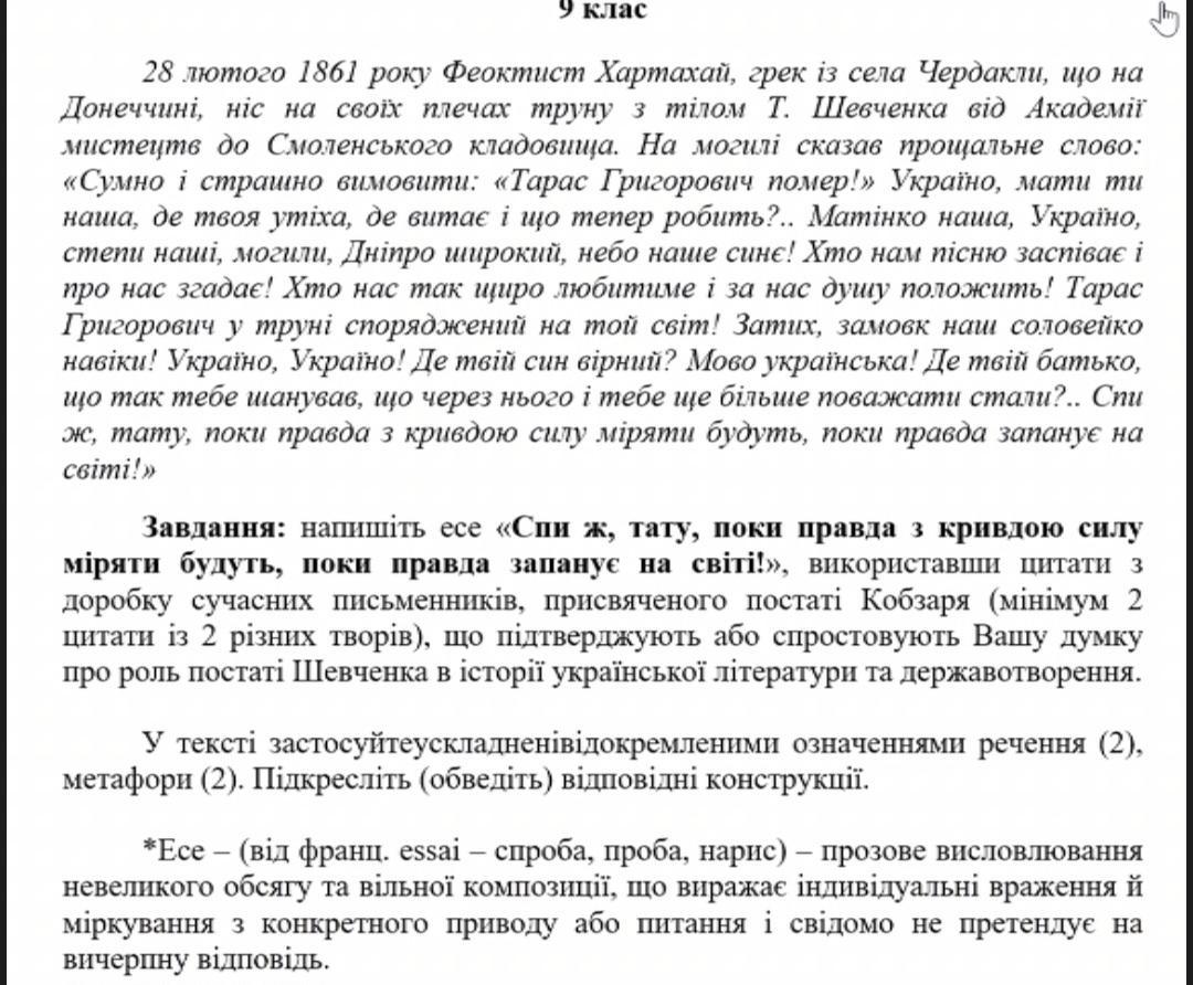 Завдання: напишіть есе «Спи ж, тату, поки правда з кривдою силу міряти будуть, поки правда запанує на світі!», використавши цитати з доробку сучасних письменників, присвяченого постаті Кобзаря (мінімум 2 цитати із 2 різних творів), що підтверджують або спростовують Вашу думку про роль постаті Шевченка в історії української літератури та державотворення.