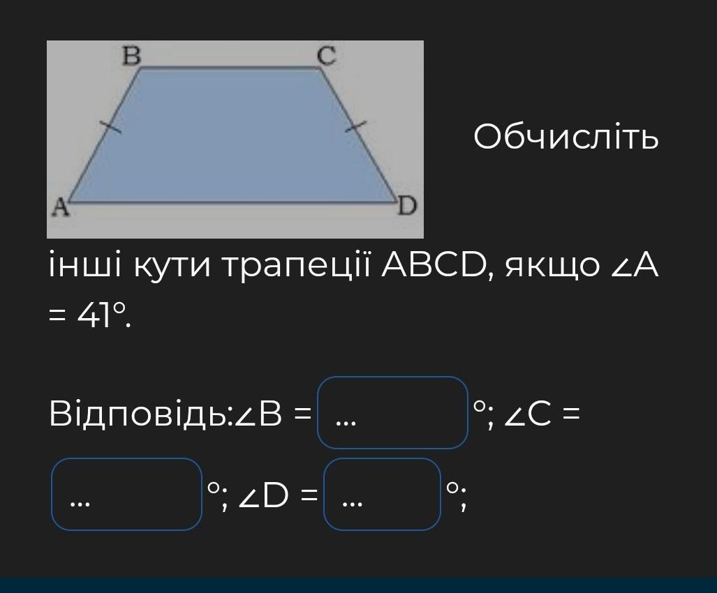 В рівнобічній трапеції гострі кути рівні між собою і тупі кути рівні між собою.