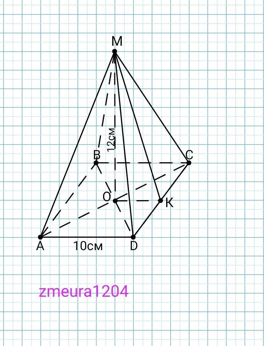 5. Сторона основи правильноï чотирикутної піраміди дорівнює 10см, а висота піраміди - 12см. Обчисліть площу бічної поверхні піраміди. (26.) III рівень