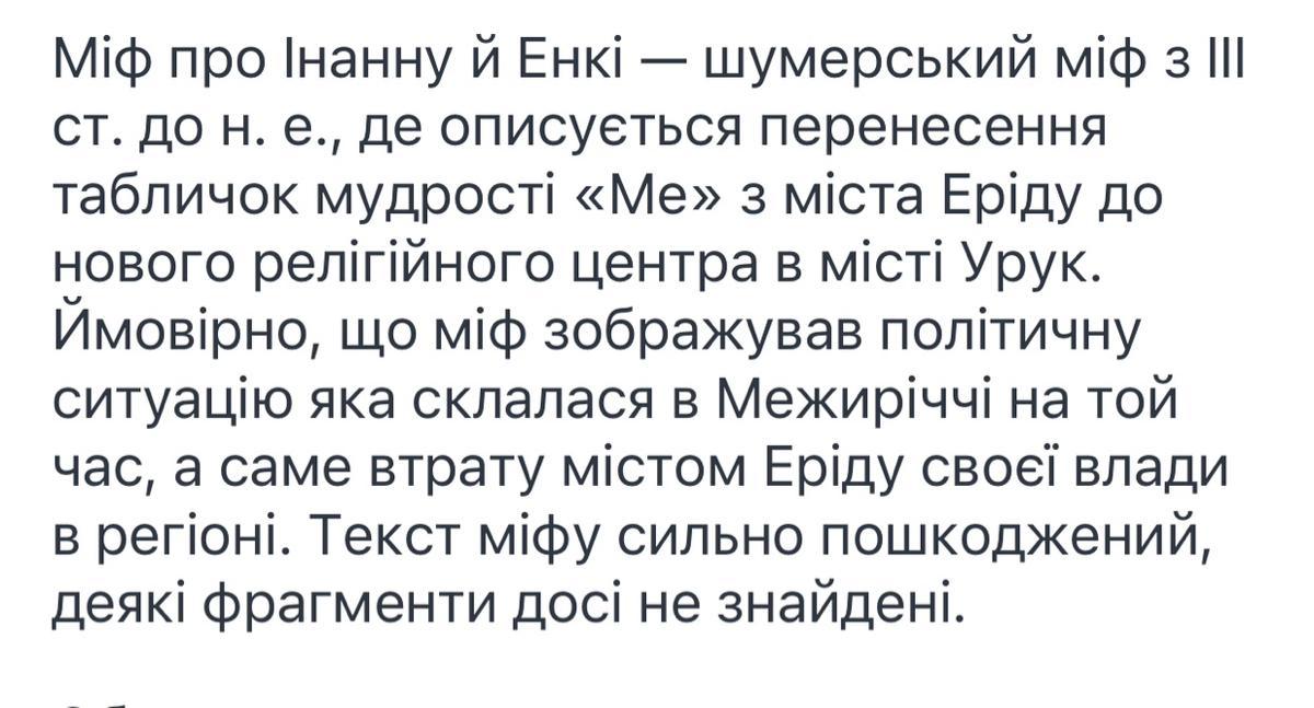 Міф про Інанну й Енкі — шумерський міф з III ст. до н. е., де описується перенесення табличок мудрості «Ме» з міста Еріду до нового релігійного центра в місті Урук. Ймовірно, що міф зображував політичну ситуацію яка склалася в Межиріччі на той час, а саме втрату містом Еріду своєї влади в регіоні. Текст міфу сильно пошкоджений, деякі фрагменти досі не знайдені.