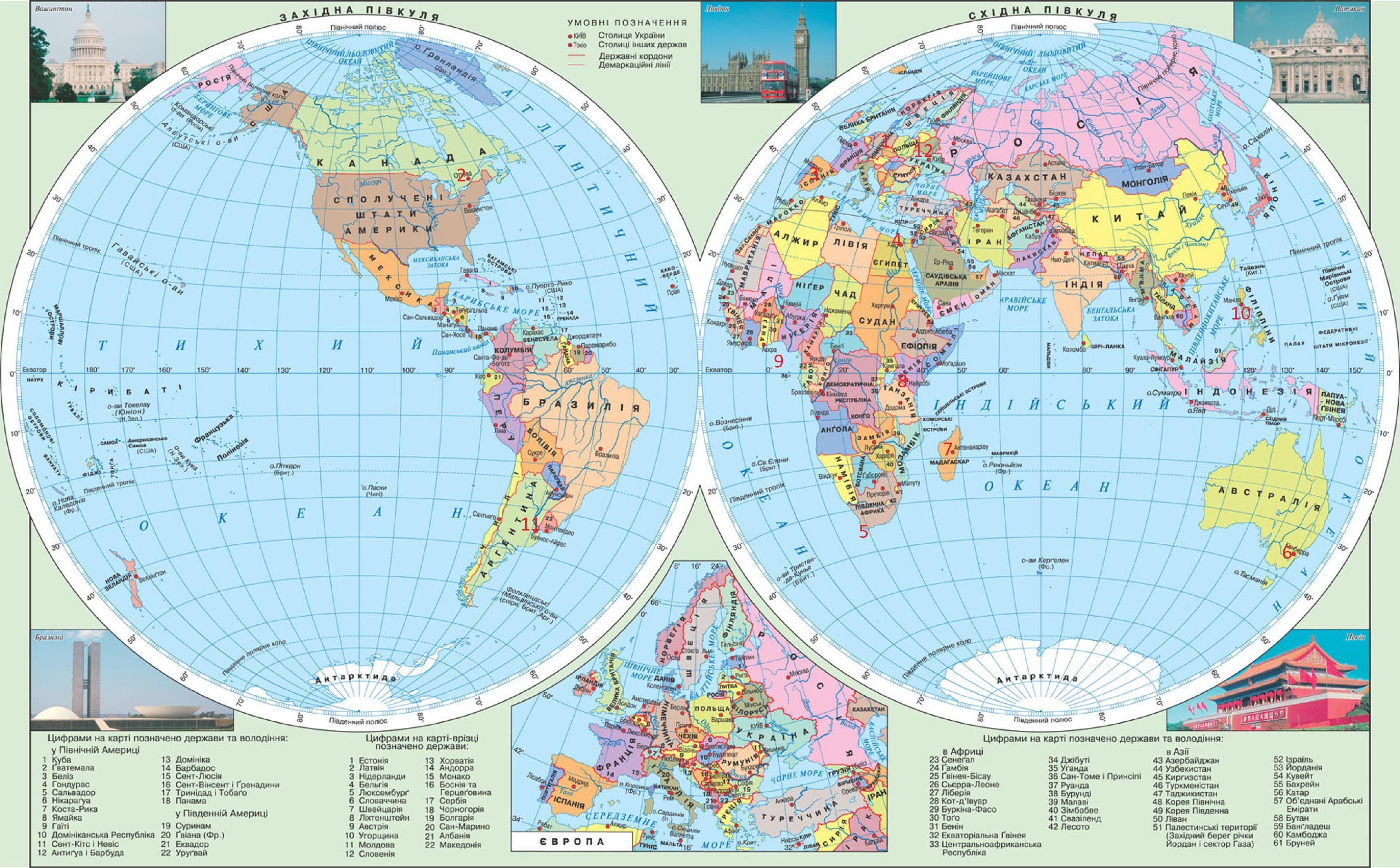 міста, що позначенi на політичній карті півкуль.
