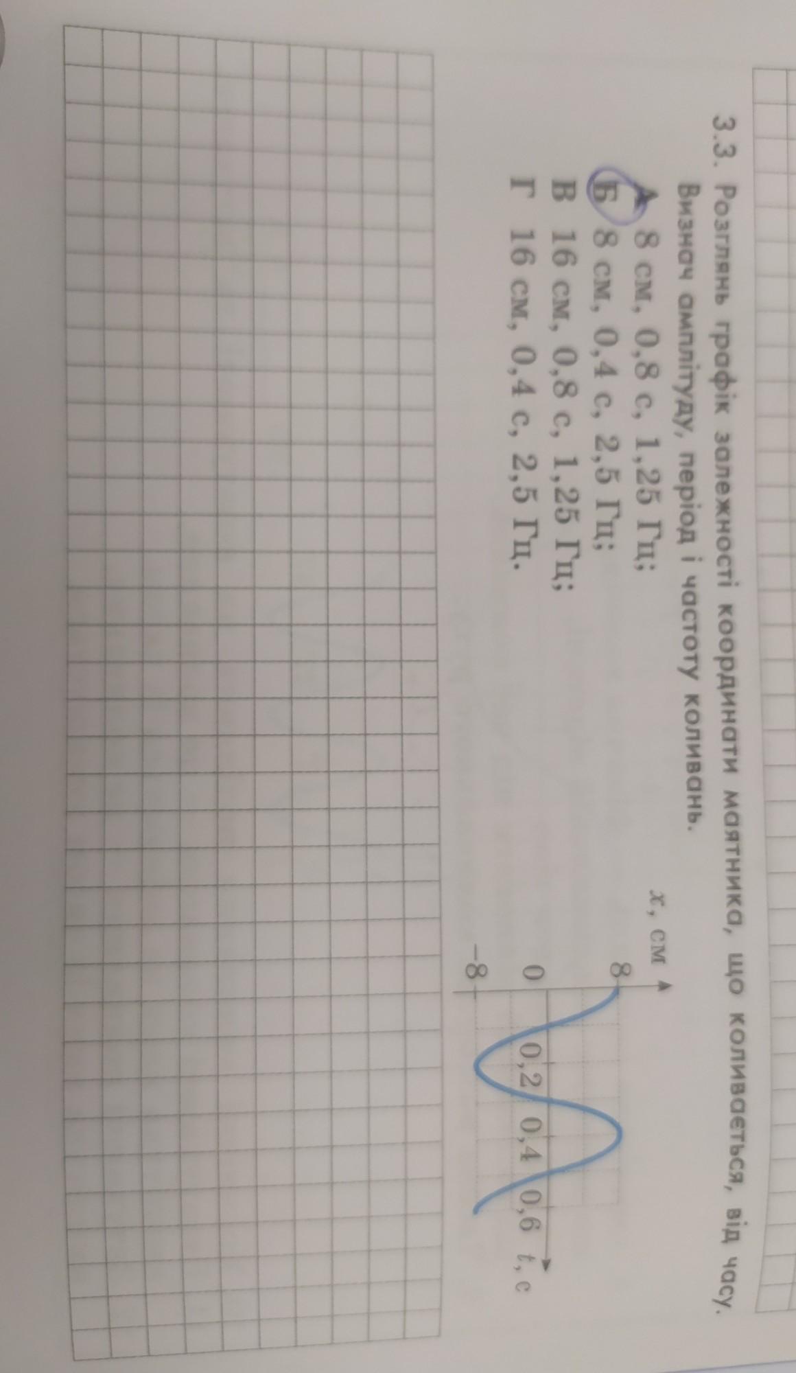 3.3. Розглянь графік залежності координати маятника, що коливається, від часу. Визнач амплітуду, період і частоту коливань.