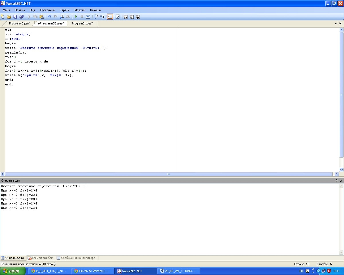 2) строчка цикла должна выглядеть так :"For x:=(-8) to 0 do"