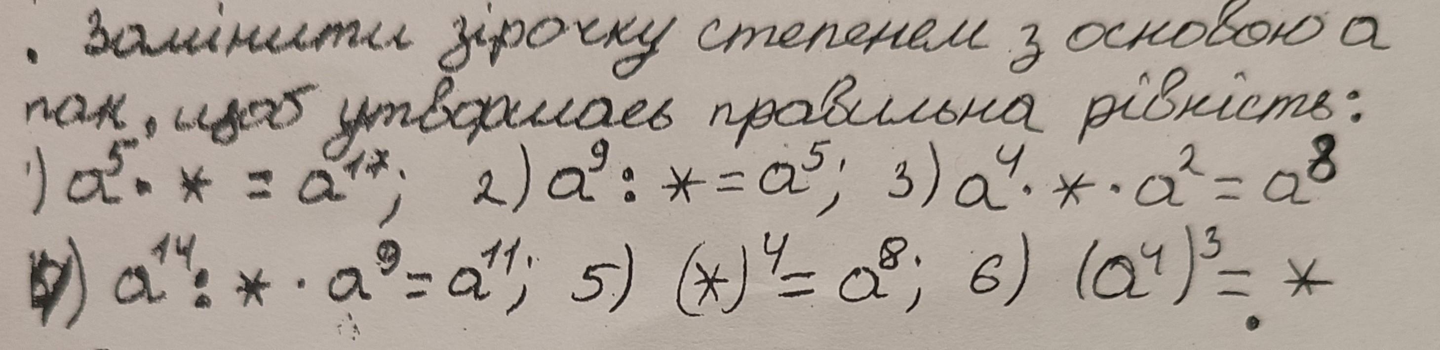 1)а⁵*а¹²=а¹⁷ 2)а⁹:а⁴=а⁵ 3)а⁴*а²*а²=а⁸