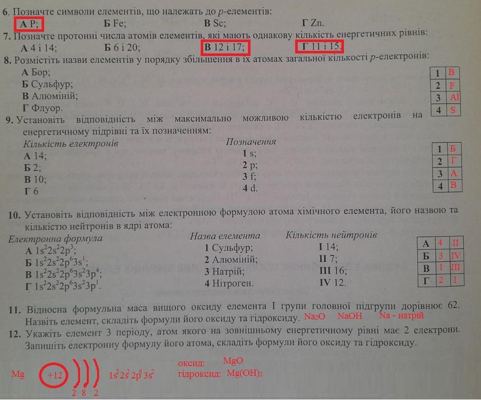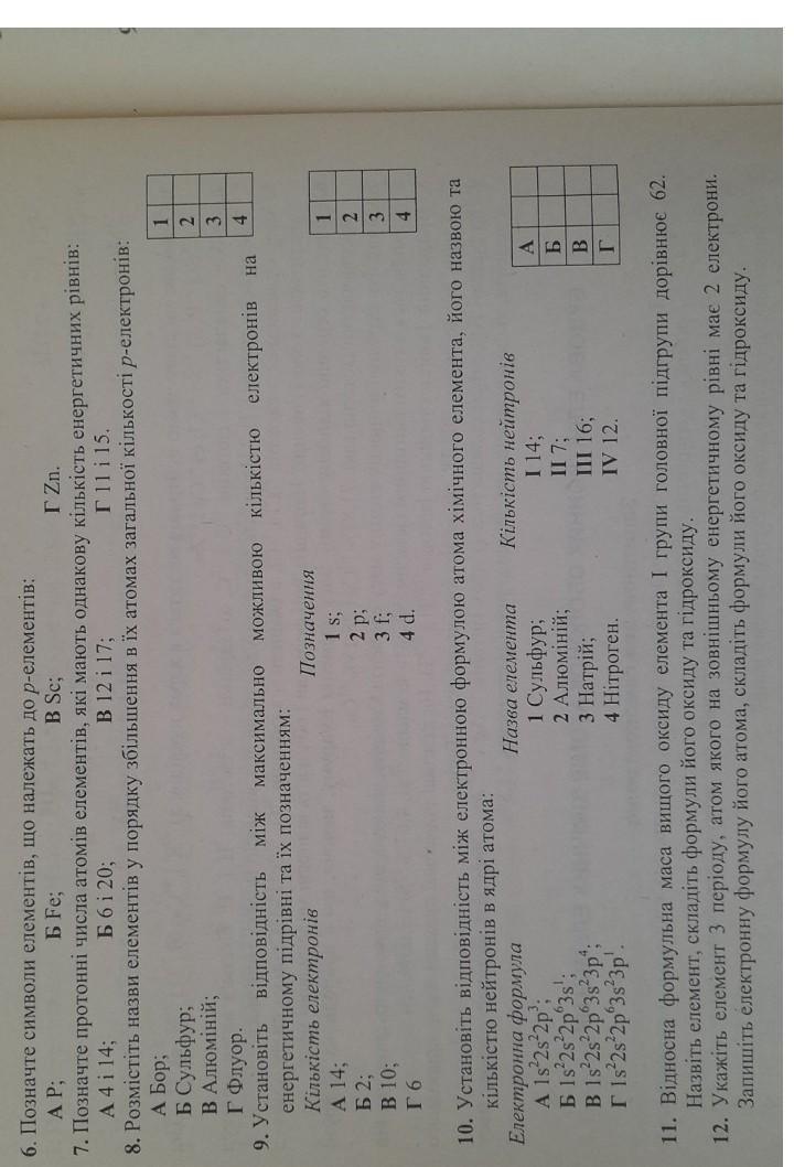 срочно 6. Позначте символи елементів, що належать до р-елементів: A P; Б Fe; B Sc; I Zn. 7. Позначте протонні числа атомів елементів, які мають однакову кількість енергетичних рівнів: А 4 i 14; Б 6 1 20; B 12 i 17; г 111 15. 8. Розмістіть назви елементів у порядку збільшення в їх атомах загальної кількості р-електронів: А Бор; Б Сульфур; В Алюміній; Г Флуор. 9. Установіть відповідність Мiж максимально можливою кiлькiстю електронів енергетичному пiдрiвнi та їх позначенням: Кількість електронів A 14; Б 2; в 10; Г6 ПОЗначення 1 s; 2 p; 3 f; 4 d. Електронна формула A 1s²2s²2p'; Б 1s22s22p 3s'; B 1s22s22p 3s23p; г 1s²2s22p'3s²3p'. Назва елемента 1 Сульфур; 2 Алюміній; 3 Натрiй; 4 Нітроген. Кількість нейтронів I 14; 17; На III 16; IV 12. 1 2 3 4 Б B Г Lalas ▬▬▬ 10. Установіть вiдповiднiсть між електронною формулою атома хiмiчного елемента, його назвою та кількістю нейтронів в ядрi атома: |-AMT 1 2 3 4 11. Відносна формульна маса вищого оксиду елемента I групи головної підгрупи дорівнює 62. Назвiть елемент, складiть формули його оксиду та гідроксиду. 12. Укажіть елемент 3 періоду, атом якого на зовнішньому енергетичному на 2 електрони. Запишіть електронну формулу його атома, складiть формули його оксиду та гідроксиду.