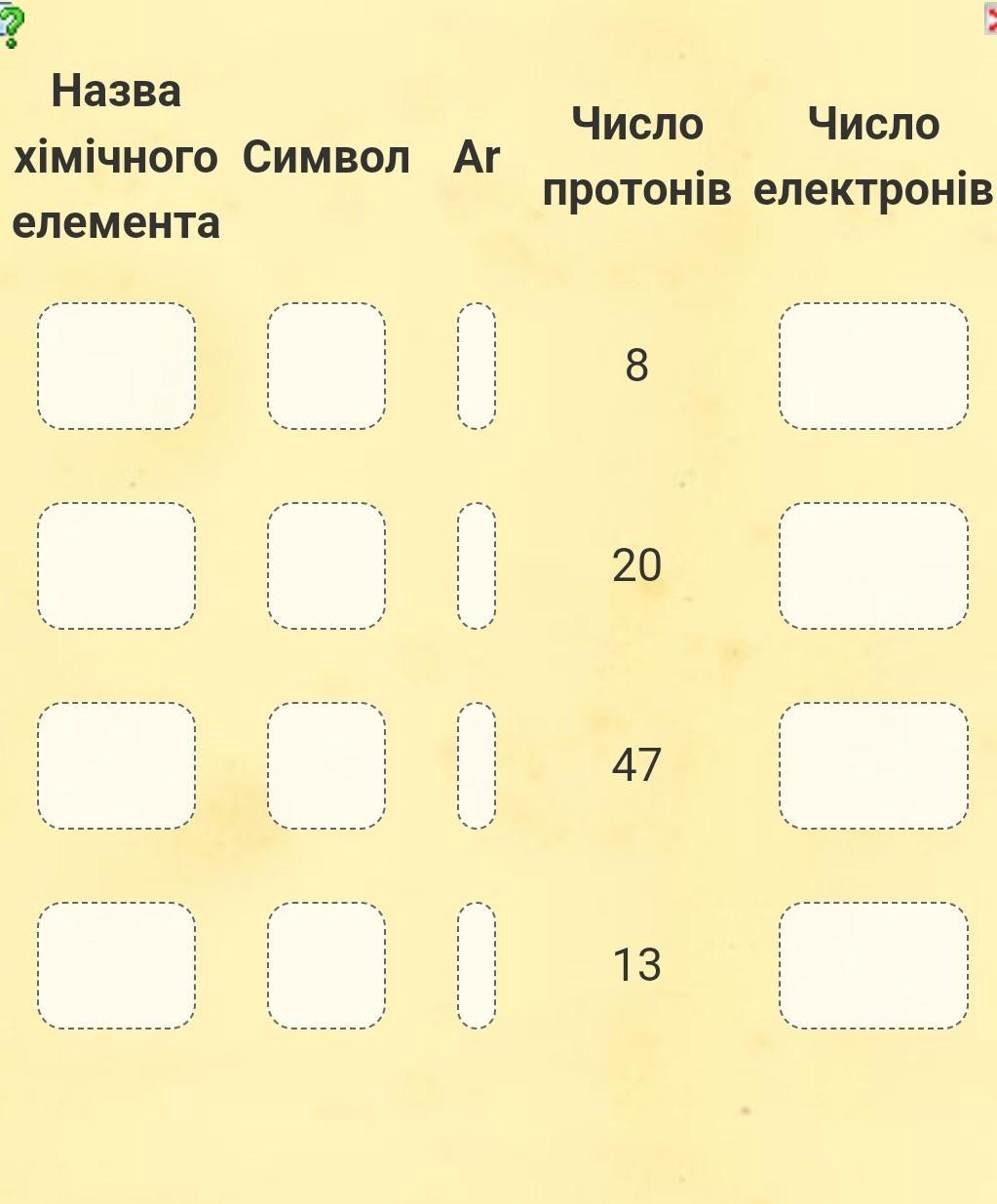 Назва хімічного Символ Ar елемента 200 000 O 01 Число Число протонів електронів 8 20 47 13 ПОСП прошуу помогите, даю 40 балов