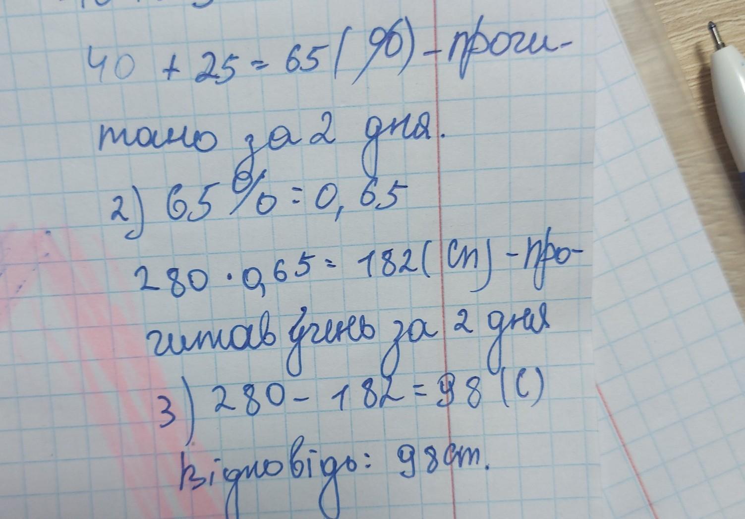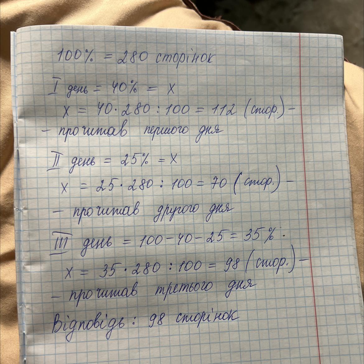 Учень прочитав книжку,що має 280 сторінок .Першого дня він прочитав 40% усіх сторінок ,Другого-25% усіх сторінок,а третього-решту.Скільки сторінок прочитав учень третього дня