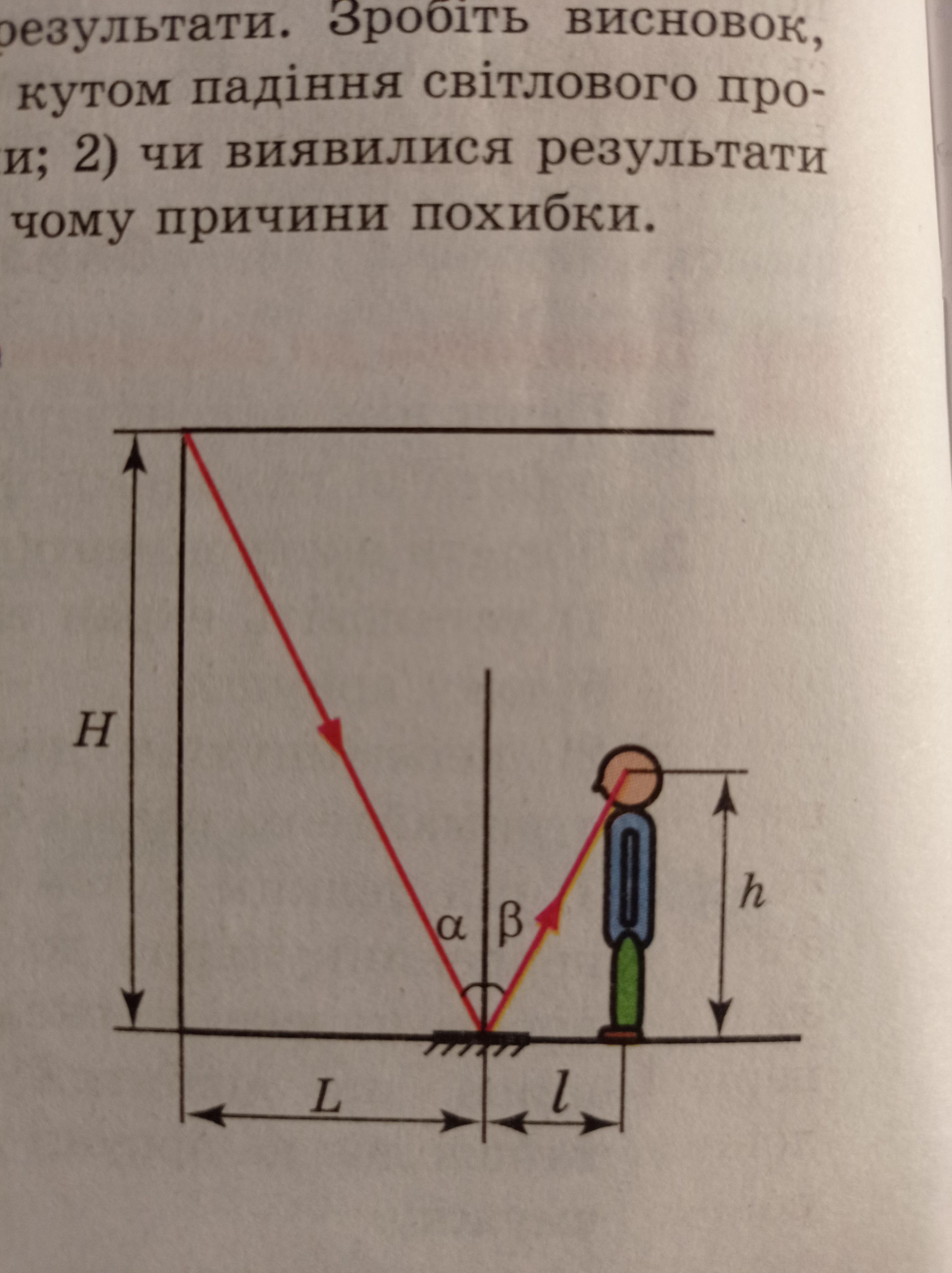 Скориставшись рисунком подумайте та запишіть план проведення експеременту з визначення висоти кімнати за допомогою плоского дзеркала;зазначте необхідне обладнання. За можливості проведіть експеремент
