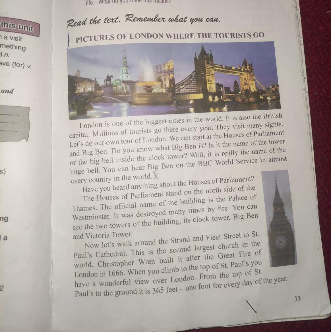 London is one of the largest cities in the world. This is the British capital. Millions of tourists come there every year. Let's take our own tour of London for tourists. We can start with the parliament building and Big Ben. Big Benit is really the name of a huge bell. The Houses of Parliament are located on the north bank of the Thames. The official name of the building is the Palace of Westminster.. Walk along the Strand and Fleet Street to St Paul's Cathedral. It is the second largest church in the world. When you climb to the top of St. Paul's Cathedral, you have a wonderful view of London. From the top of St. Paul's Cathedral to the ground 365 feet - one foot for every day of the year.