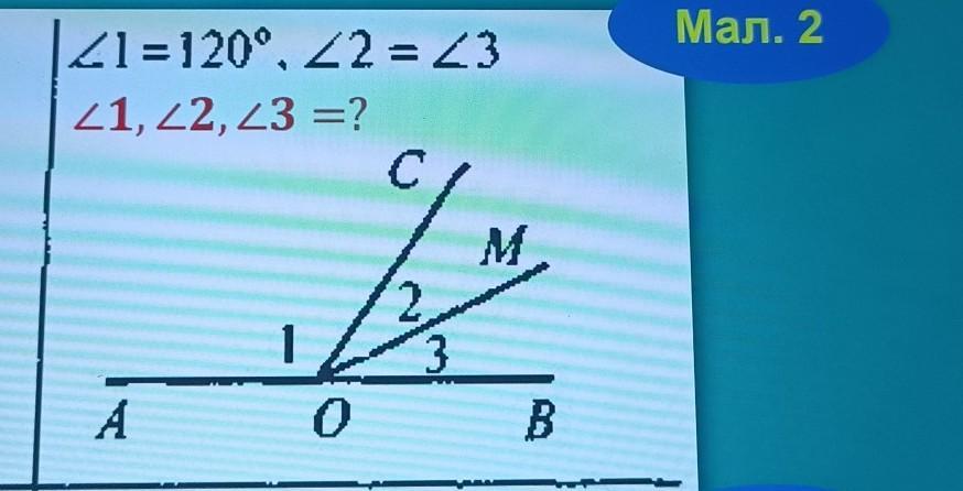 По условию ∠1 = 120°, значит ∠2+∠3 = ∠АОВ - ∠1 = 180°-120°=60°